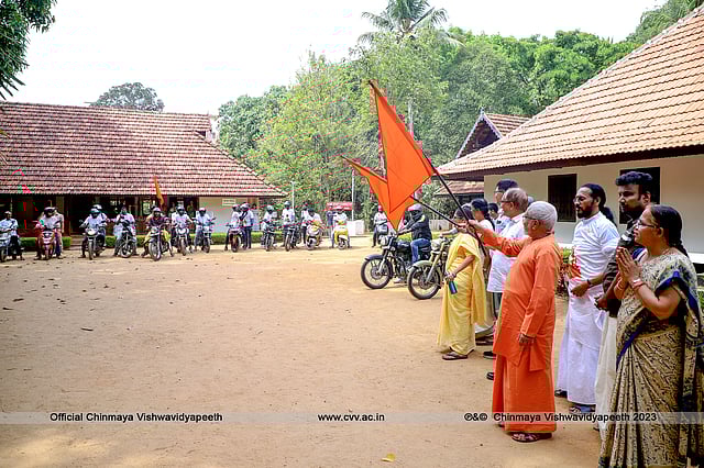 As a part of Sri Adi Sankaracharya Jayanti Celebrations 2023, on 25 April 2023, the members of Chinmaya Vishwa Vidyapeeth and Chinmaya International Foundation (CIF) Veliyanad, jointly organised the ‘Chinmaya Bike Rally’ from Veliyanad to Kalady. Br. Sudheer Chaitanya (National Council Member, All India Chinmaya Yuva Kendra) and Dr. Anil Narayanan N. (Assistant Dean, CVV) coordinated the event. The riders gathered at CVV—in front of the Melpazhur Mana illam, the maternal home and birthplace of Adi Sankaracharya—and began their journey to Kalady, the paternal home of Sri Adi Sankaracharya.